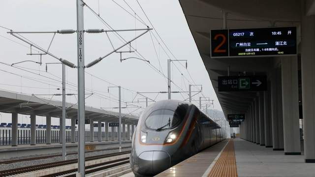 最快1小时32分可达!大湾区携手北部湾,广州至湛江高铁开通运营!随着G9785次“复兴号”列车驶出广州白云站,广州至湛江高铁开通运营,广州白云站至湛江北站最快1小时32分可达,北部湾城市群与粤港澳大湾区时空距离大幅压缩。这条设计时速350公里、正线全长约401公里的交通大动脉,始于广州,途经佛山、肇庆、云浮、阳江、茂名等市,终至湛江,东联广州枢纽,在湛江北站与在建的合浦至湛江高铁、规划建设的湛江至海口高铁相连接,路网地位十分重要。广湛高铁通车运营后,阳江、茂名、湛江三市结束不通时速350公里高铁的历史,标志着广东向着“市市通350高铁”目标迈出坚实一步,对完善区域路网布局,发挥粤港澳大湾区辐射带动作用,促进区域经济社会高质量发展,建设富有活力和国际竞争力的一流湾区和世界级城市群,具有十分重要的意义。
