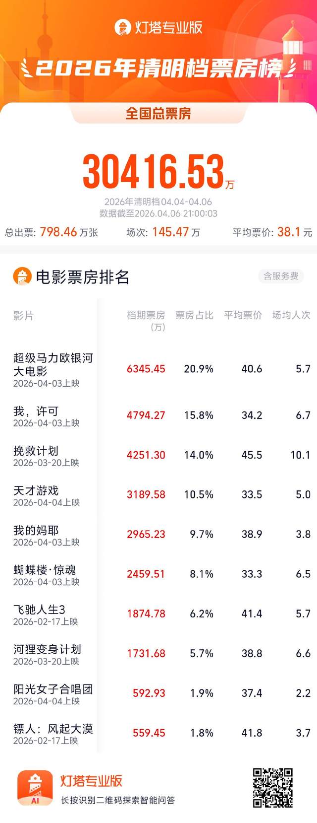 清明档3亿收官:进口大片稳扎稳打,国产黑马惊喜不断!为期三天的清明档正式落下帷幕。据灯塔专业版数据,本届清明档全国电影总票房突破3亿元,《超级马力欧银河大电影》《我,许可》《挽救计划》位列档期票房前三位。总放映场次超145万场,刷新中国影史清明档场次纪录。档期内共有14部新片集中上映,叠加此前上映的优质影片,形成了合家欢动画、现实温情、硬核科幻、悬疑犯罪等多元题材共生的市场格局。